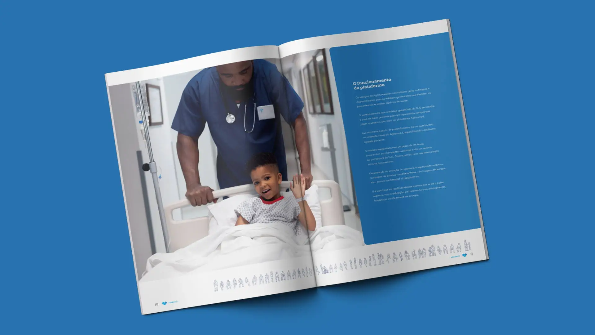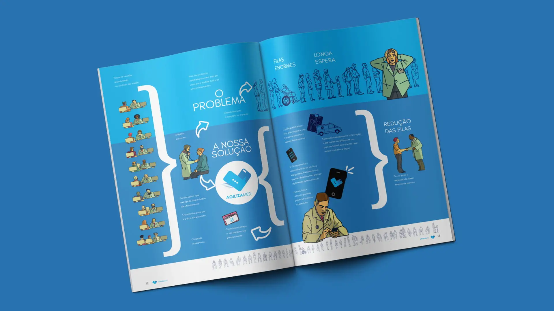 O projeto gráfico foi concebido para valorizar a tecnologia e o impacto social da AgilizaMed, com uma identidade visual contemporânea, uso estratégico de infográficos, ilustrações exclusivas, criadas pelo ilustrador Fabio Abreu, ajudam a organizar a hierarquia da informação. Cada elemento visual foi pensado para conduzir o leitor por conteúdos densos de forma fluida, reforçando dados, processos e resultados de maneira didática. A cereja do bolo do projeto é a fila no rodapé das páginas que vai diminuindo ao longo da publicação conforme a apresentação do conteúdo evolui.