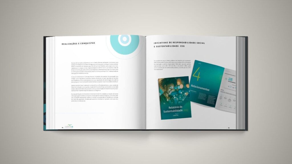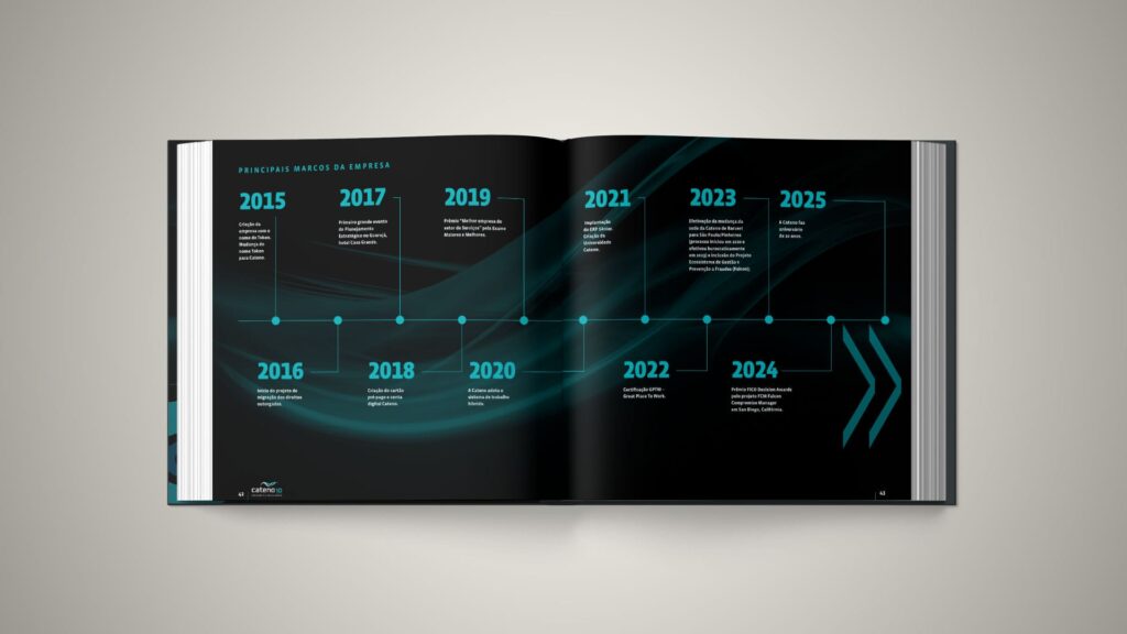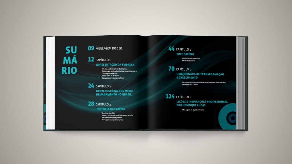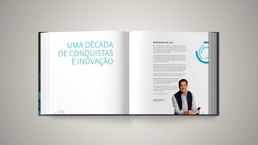 Cada detalhe foi cuidadosamente pensado para transformar o livro em um objeto de celebração e memória. O resultado é uma publicação que não apenas registra a história da Cateno, mas também materializa seus valores, sua evolução e sua visão de futuro, comemorando em grande estilo os 10 anos de uma empresa essencial para o ecossistema financeiro brasileiro.