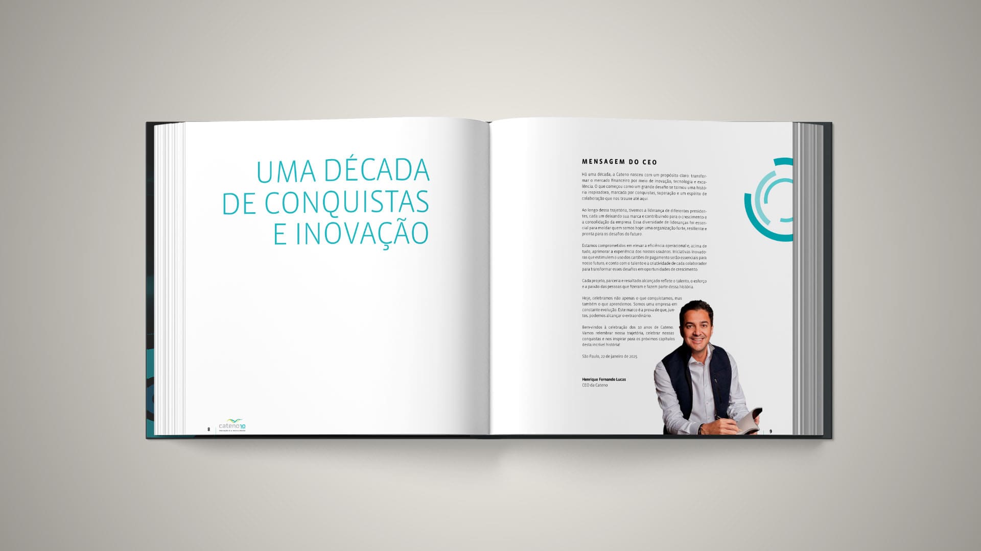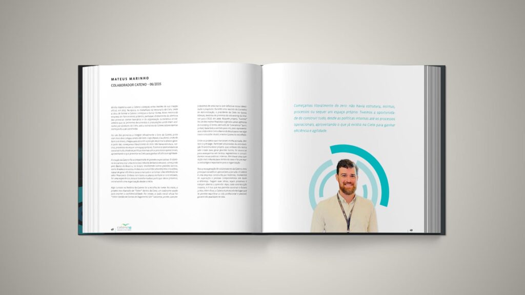 Para nosso estúdio, celebrar trajetórias sólidas exige um projeto editorial à altura da história construída. Foi com esse olhar que desenvolvemos o livro comemorativo de 10 anos da Cateno, empresa responsável pelos sistemas de pagamento dos cartões do Banco do Brasil.