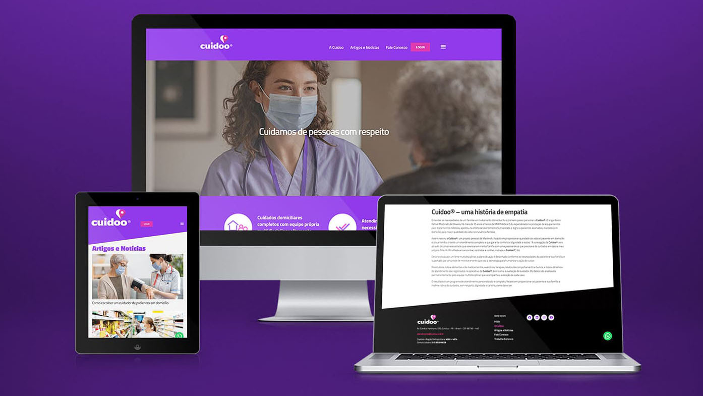 Elaboramos todo o trabalho de naming, identidade visual e site da Cuidoo®, uma empresa especializada em atendimento humanizado e digno a pacientes acamados, que necessitam de cuidados em domicílio para maior qualidade de vida e convivência familiar.