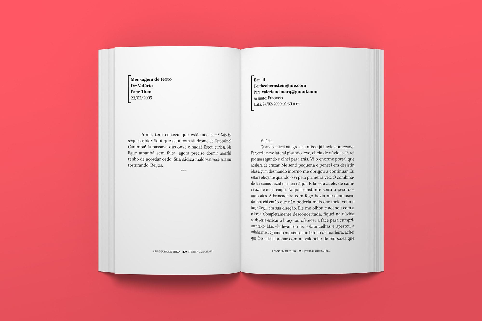 Fizemos o projeto gráfico e a diagramação do livro “A procura de Theo”, de Teresa Guimarães. Para deixar muito claro que é um romance episcopal – narrado a partir de correspondências –, criamos um projeto que destaca cada uma delas e o meio pelo qual foi enviada. A trama vai se desenrolando a partir de e-mails, cartas, mensagens no facebook, etc., que juntam pontos de vista diferentes e deixam, aos poucos, transparecer as caraterísticas de cada um dos personagens.